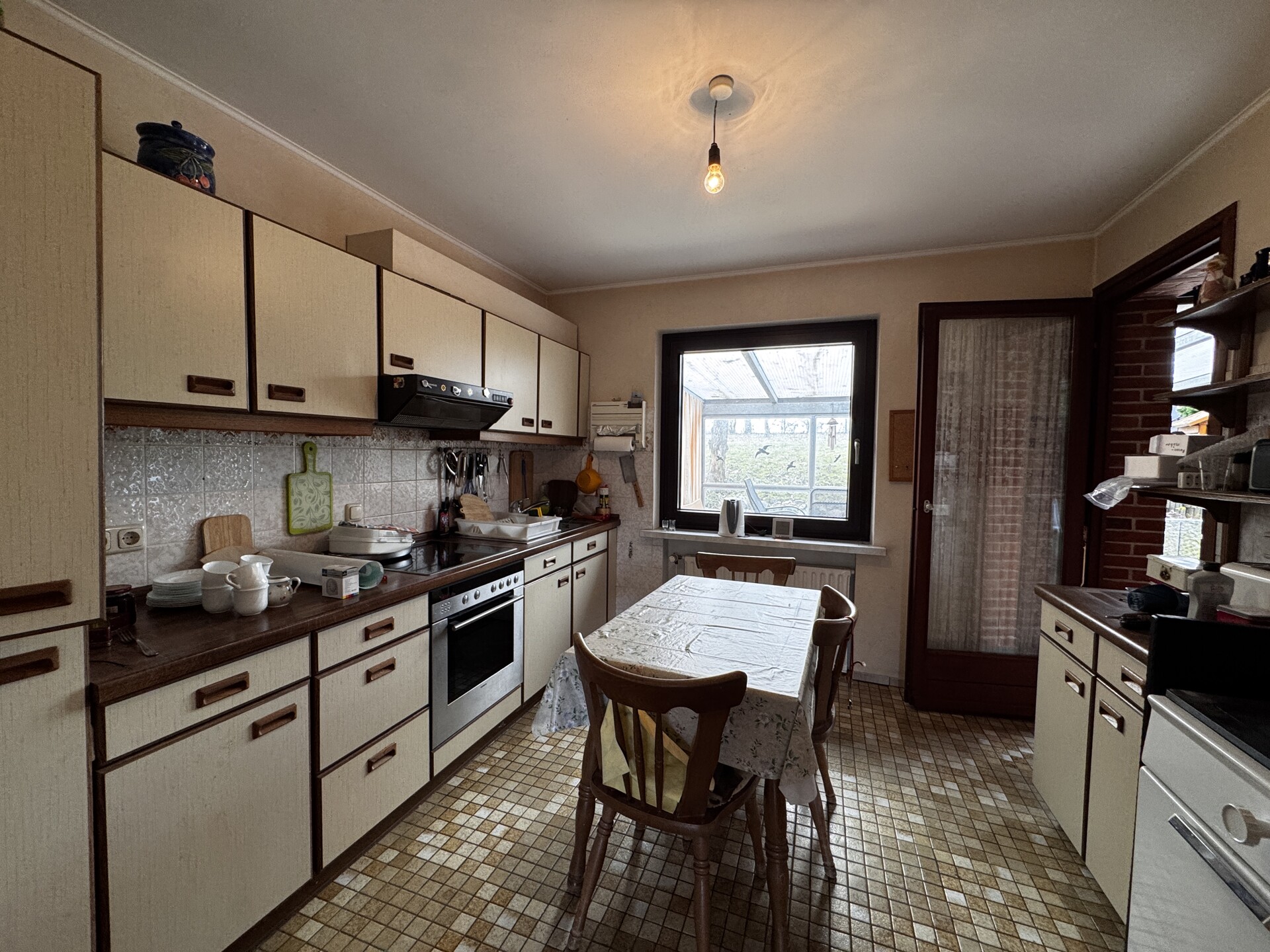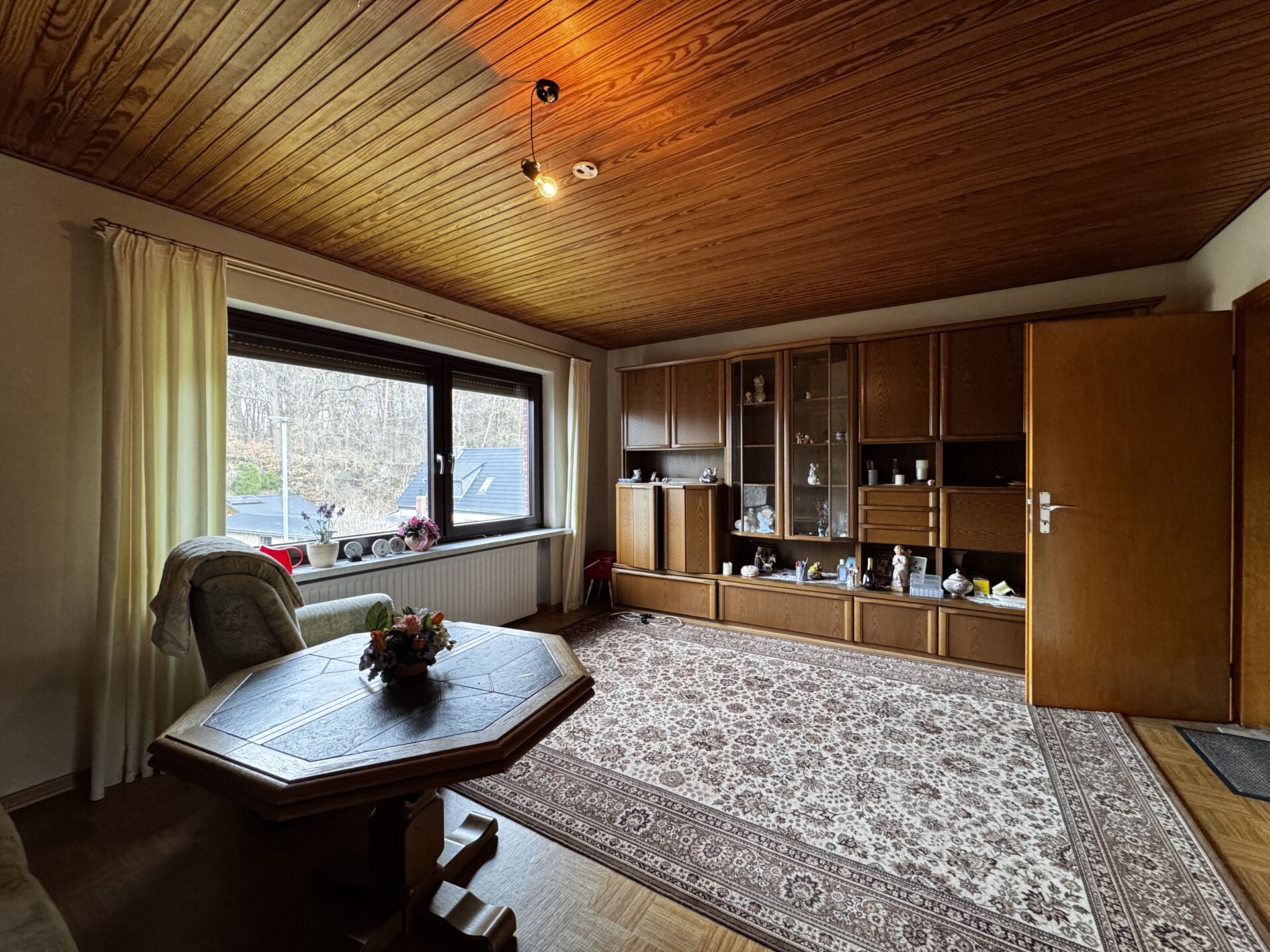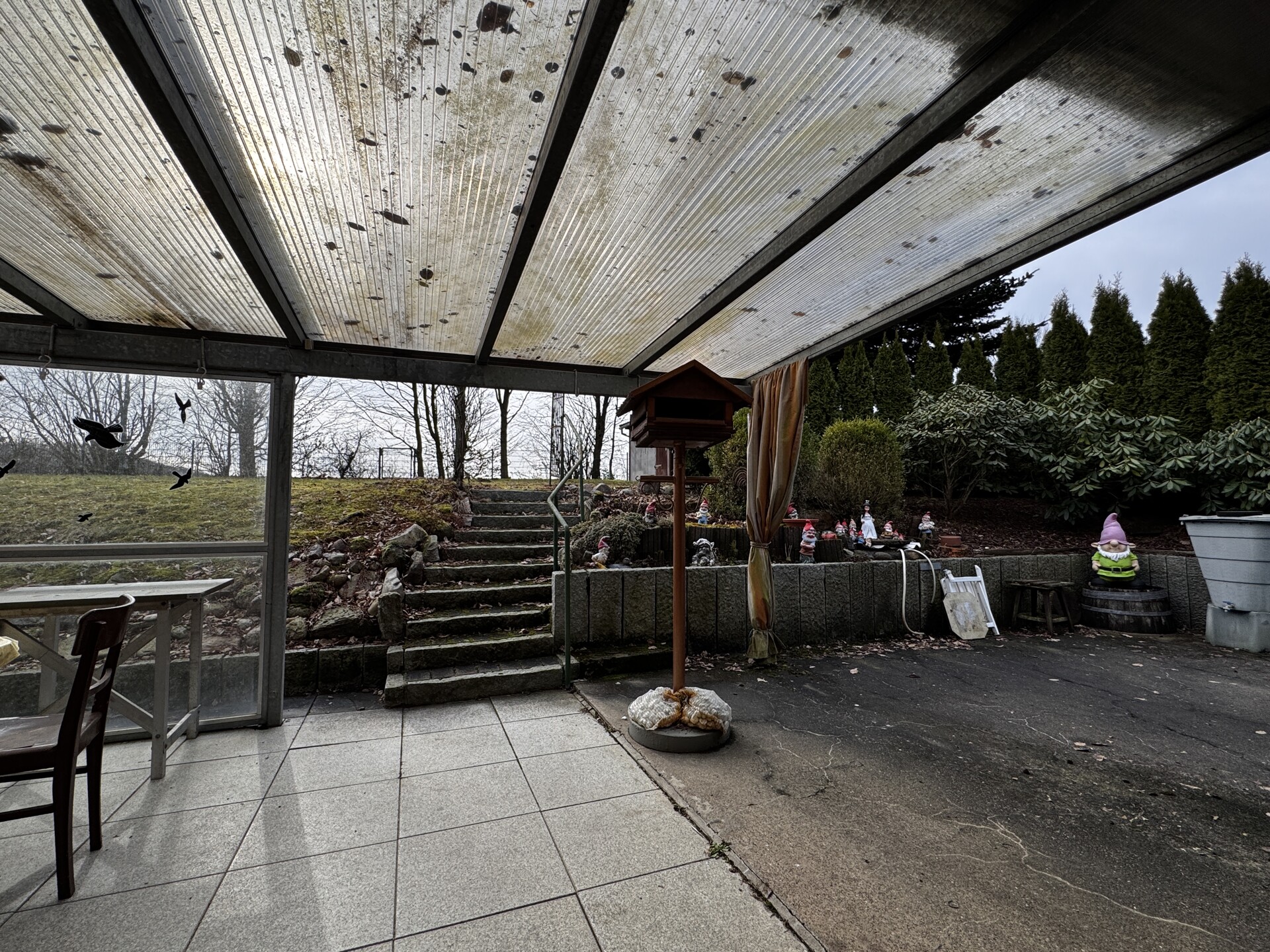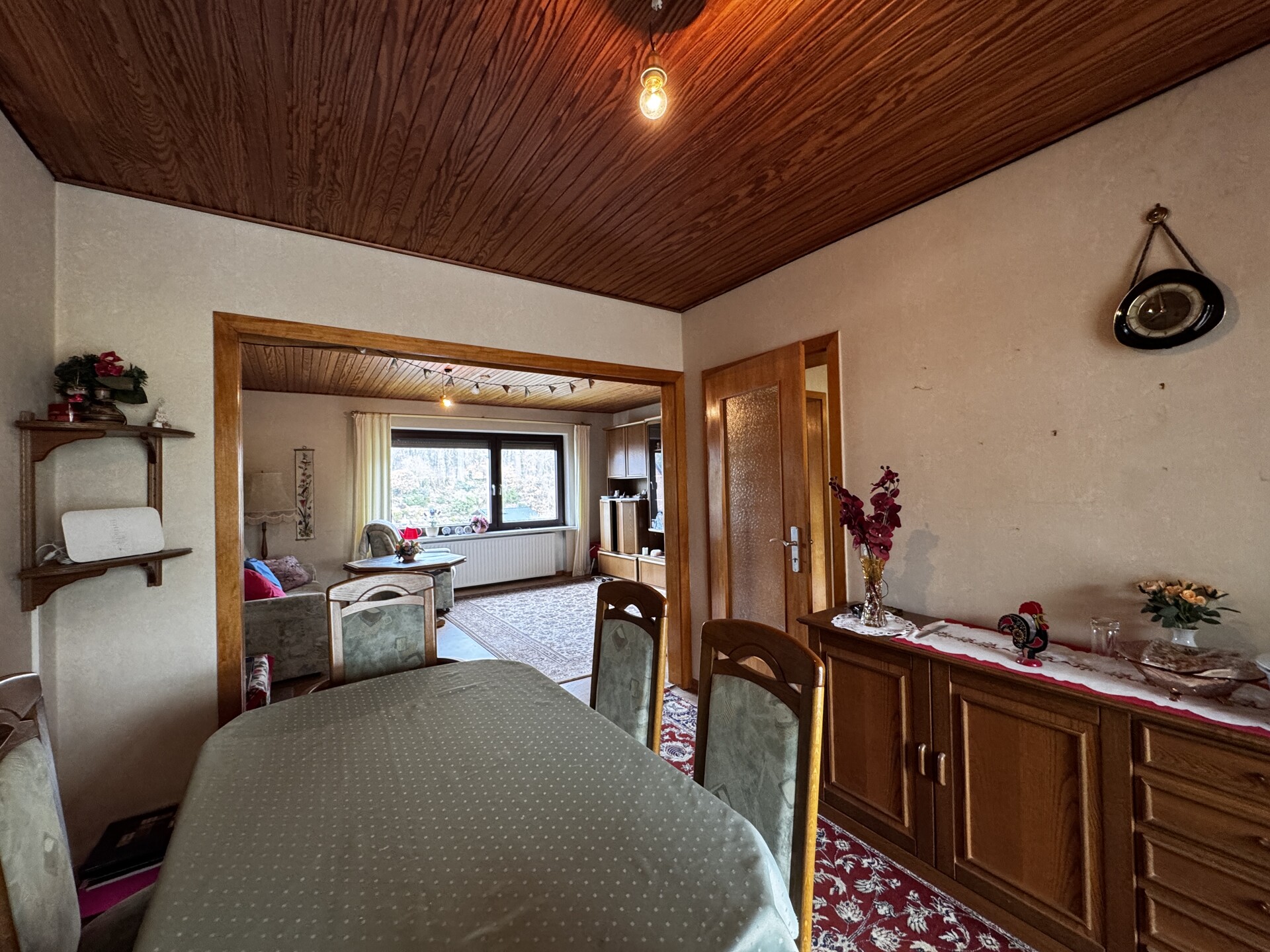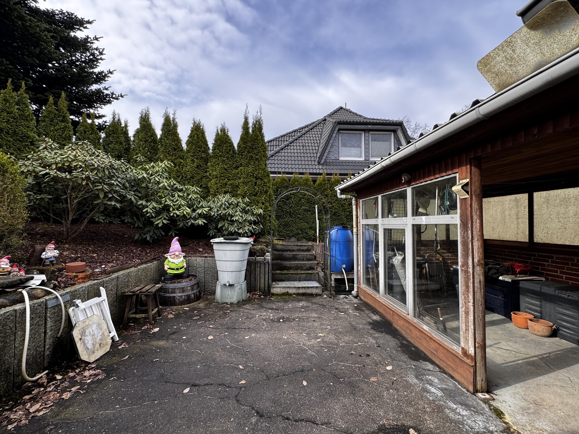 Das Haus wurde am Hang errichtet und eröffnet dadurch auf der rückwärtigen Seite einen besonders reizvollen Ausblick in die umliegende ländliche Natur. Von der Terrasse aus genießen Sie einen direkten Zugang ins Grüne – ein idealer Ort für entspannte Stunden im Freien und naturnahes Wohnen.